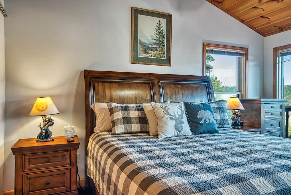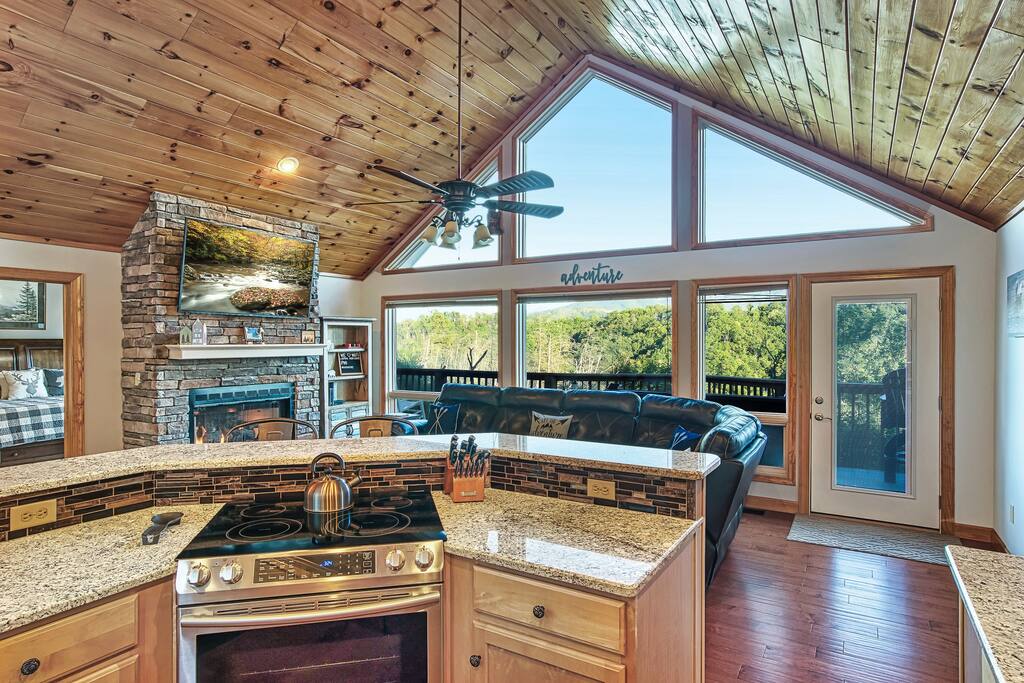 Sleeps 5 β 2 Bedrooms β 1.5 Baths β Open Concept Living Area β Hot tub β Fire pit Summit View Lodge sits in Chalet Village North, perched above Gatlinburg with panoramic Smoky Mountain views. Step inside to cathedral ceilings, tongue-and-groove walls, and floor-to-ceiling glass framing Mt. LeConte. ποΈ Bedroom 1 β King bed β Ensuite bath β Mountain views β 55β TV + sound bar ποΈ Bedroom 2 β King bed β Half bath β Mountain views β TV + barrel arcade game ποΈ Comfy sleep sofa in the living room ποΈ Living Room β Stone fireplace β 55β TV β Wall of windows β Mountain views β Sleep sofa and love seat (different from photos) πΏ Bathrooms | β Ensuite in bedroom 1 β Half bath in bedroom 2 π² Kitchen β Fully Equipped (incl. baking sheet, blender, kids' table settings) β Stainless Steel appliances β Granite Countertop β Wine glasses β Kureg coffee station β Microwave & toaster β Mountain views π Large deck with rocking chairs β Panoramic Mountain Views β Fire pit β Hot tub β High-top table β Charcoal grill (bring your own charcoal)