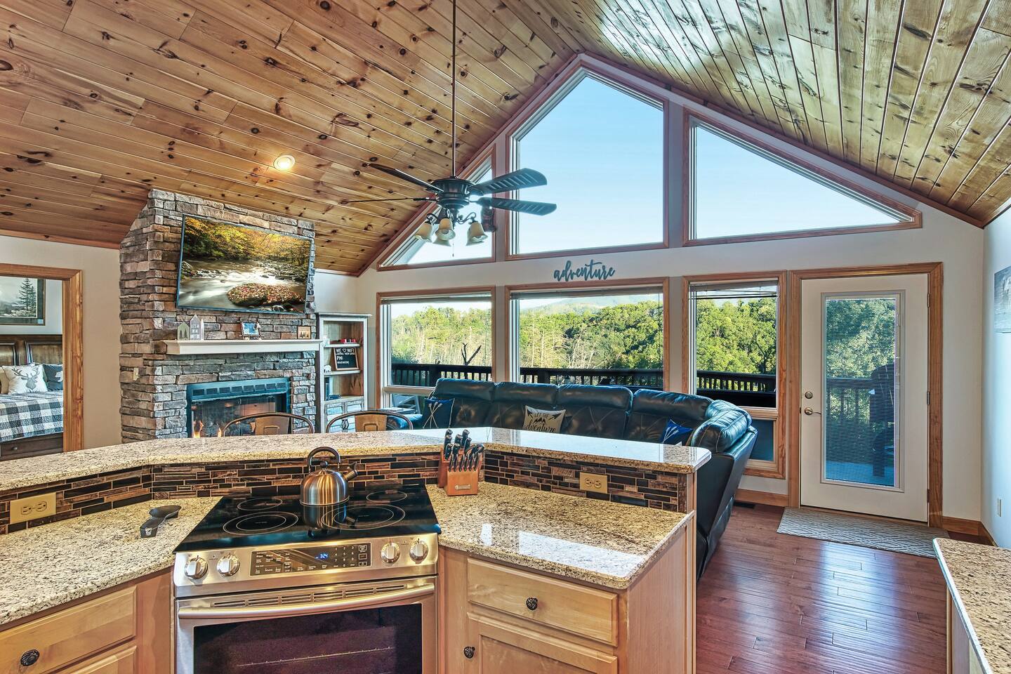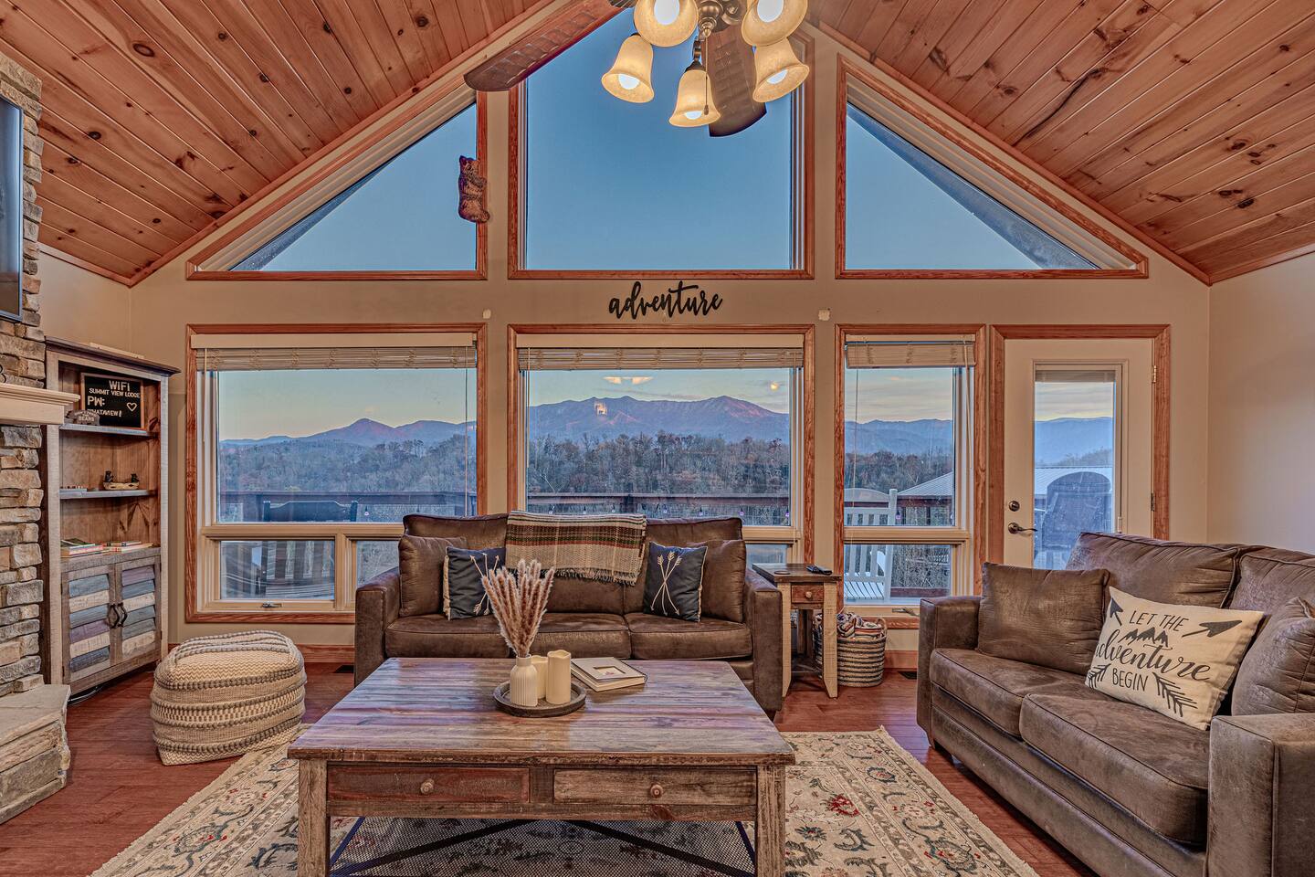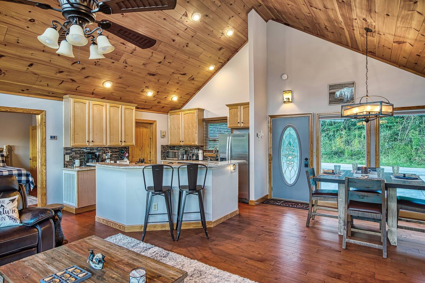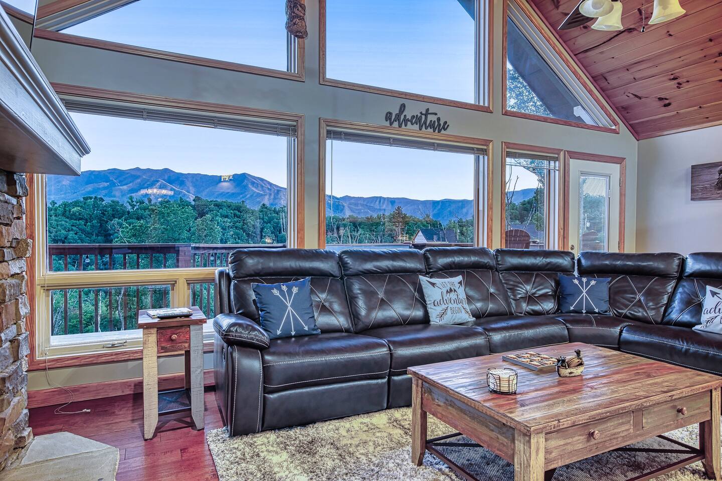 Sleeps 5 ◆ 2 Bedrooms ◆ 1.5 Baths ◆ Open Concept Living Area ◆ Hot tub ◆ Fire pit Perched over Gatlinburg in Chalet Village North, this cabin offers panoramic Smoky Mountain and Mt. LeConte views. Inside, cathedral ceilings, tongue-and-groove walls, and floor-to-ceiling windows frame the mountains perfectly. 🛏️ Bedroom 1 ◆ King bed ◆ Ensuite bath ◆ 55” TV + sound bar ◆ Ceiling fan 🛏️ Bedroom 2 ◆ King bed ◆ Half bath ◆ TV + barrel arcade game ◆ Ceiling fan 🛏️ Comfy sleep sofa in the living room 🛋️ Living Room ◆ Stone fireplace ◆ 55” TV ◆ Wall of windows ◆ Sleep sofa and love seat 🚿 Bathrooms ◆ Ensuite in bedroom 1 ◆ Half bath in bedroom 2 🍲 Kitchen ◆ Fully Equipped (incl. baking sheet, blender, kids' table settings) ◆ Stainless Steel appliances ◆ Wine glasses ◆ Keurig coffee + Tea station ◆ Microwave & toaster 🌄 Large deck with rocking chairs ◆ Panoramic Mountain Views ◆ Fire pit ◆ Hot tub ◆ High-top table ◆ Propane grill (out front)