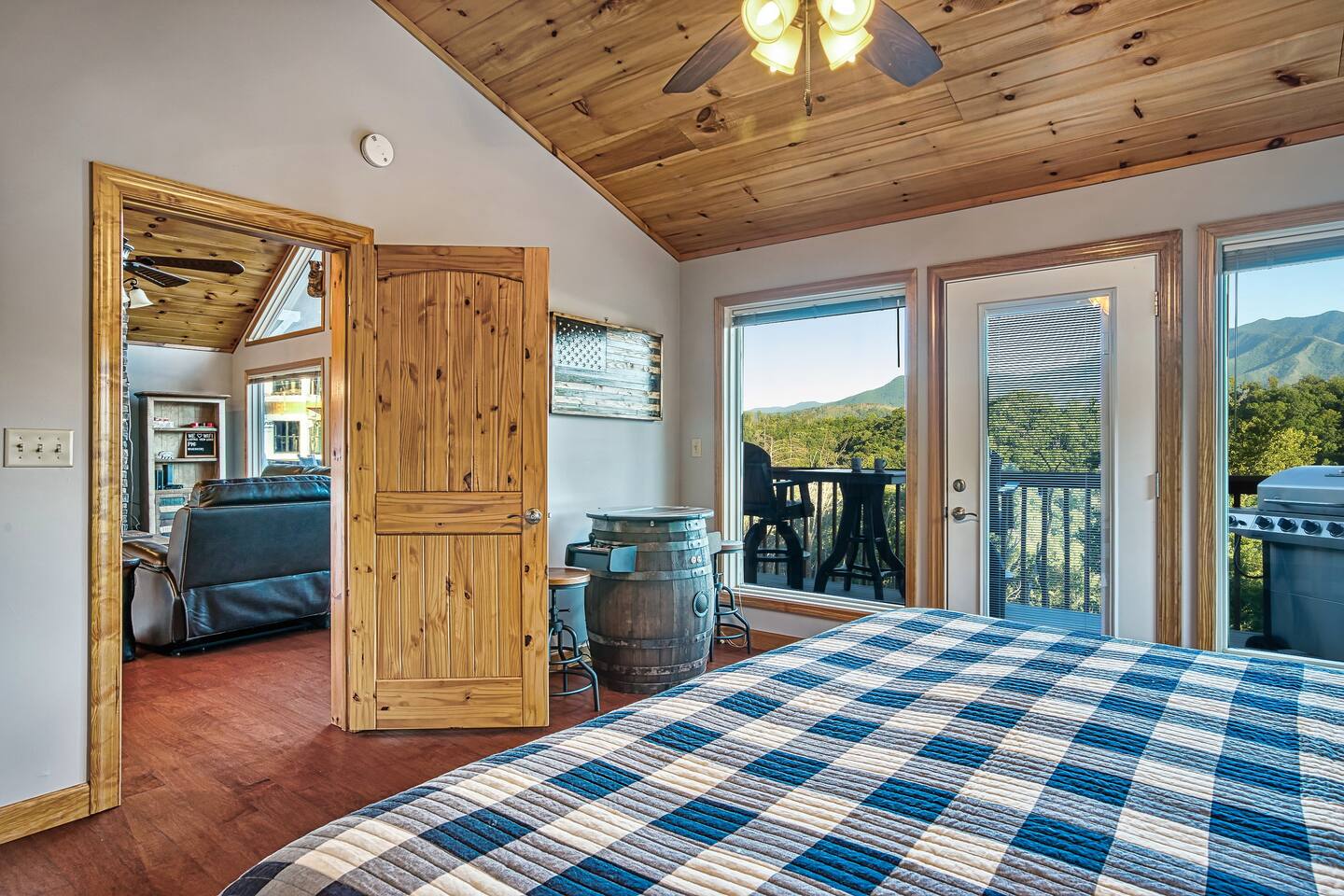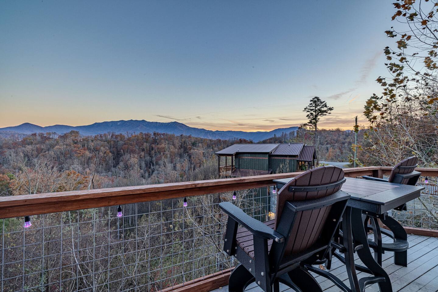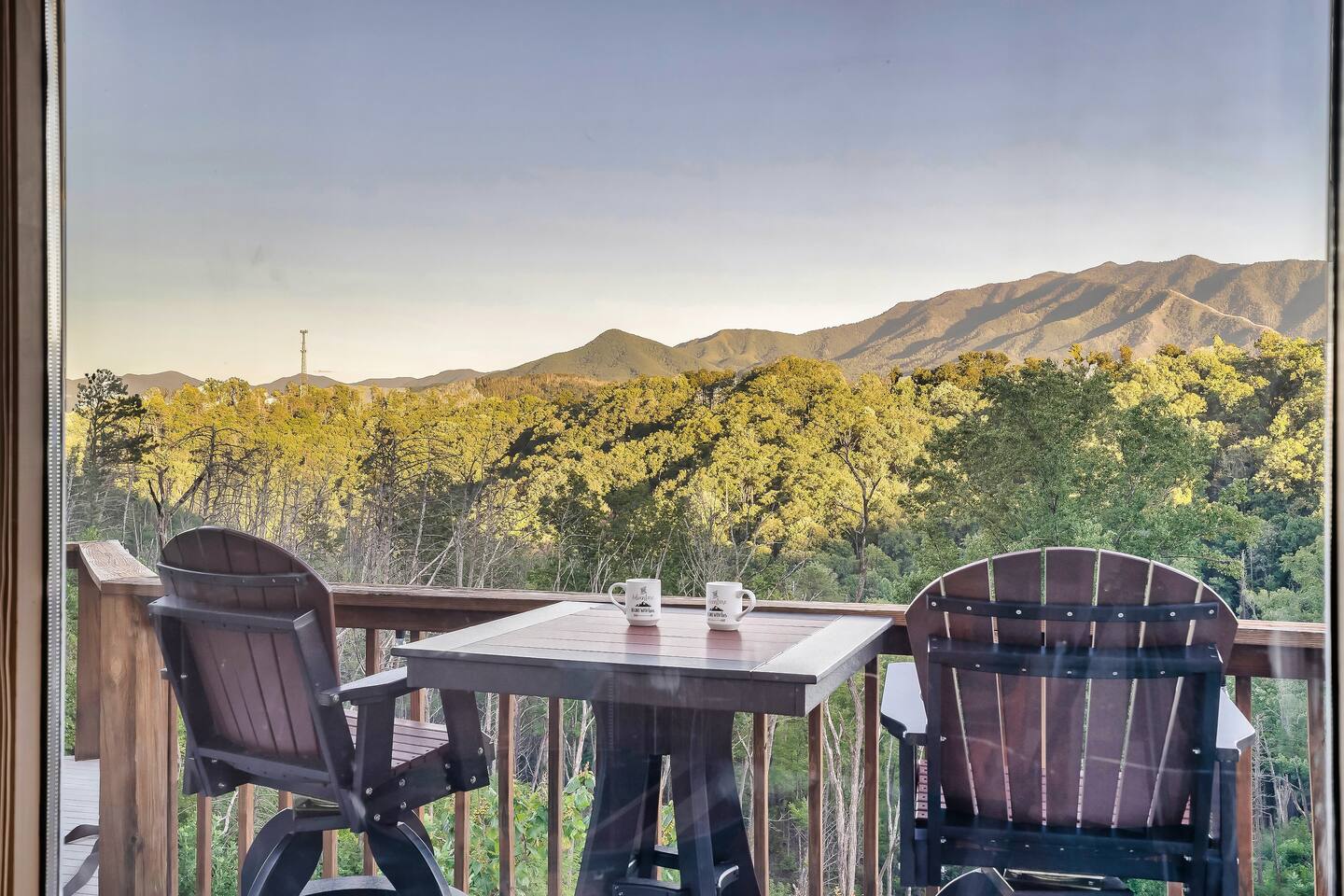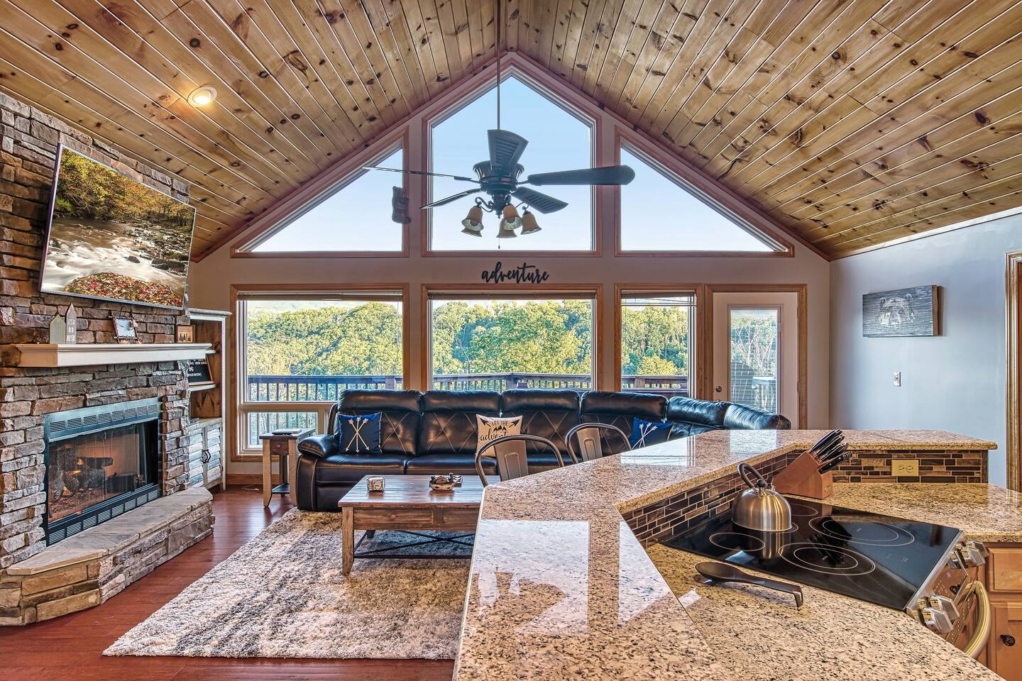 Sleeps 5 ◆ 2 Bedrooms ◆ 1.5 Baths ◆ Open Concept Living Area ◆ Hot tub ◆ Fire pit Perched over Gatlinburg in Chalet Village North, this cabin offers panoramic Smoky Mountain and Mt. LeConte views. Inside, cathedral ceilings, tongue-and-groove walls, and floor-to-ceiling windows frame the mountains perfectly. 🛏️ Bedroom 1 ◆ King bed ◆ Ensuite bath ◆ 55” TV + sound bar ◆ Ceiling fan 🛏️ Bedroom 2 ◆ King bed ◆ Half bath ◆ TV + barrel arcade game ◆ Ceiling fan 🛏️ Comfy sleep sofa in the living room 🛋️ Living Room ◆ Stone fireplace ◆ 55” TV ◆ Wall of windows ◆ Sleep sofa and love seat 🚿 Bathrooms ◆ Ensuite in bedroom 1 ◆ Half bath in bedroom 2 🍲 Kitchen ◆ Fully Equipped (incl. baking sheet, blender, kids' table settings) ◆ Stainless Steel appliances ◆ Wine glasses ◆ Keurig coffee + Tea station ◆ Microwave & toaster 🌄 Large deck with rocking chairs ◆ Panoramic Mountain Views ◆ Fire pit ◆ Hot tub ◆ High-top table ◆ Propane grill (out front)