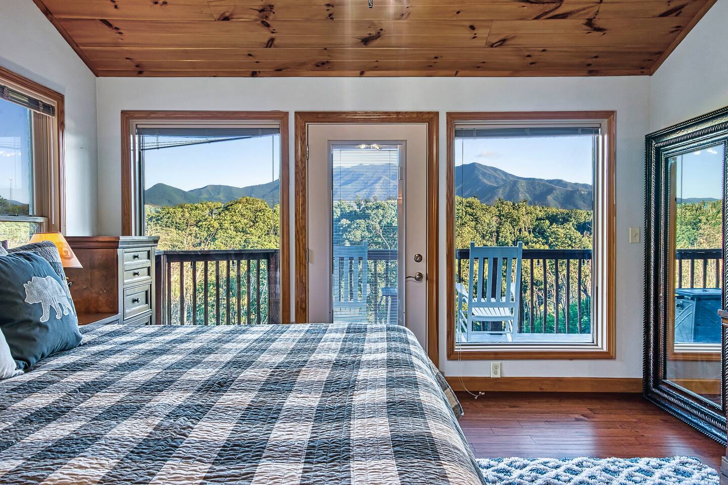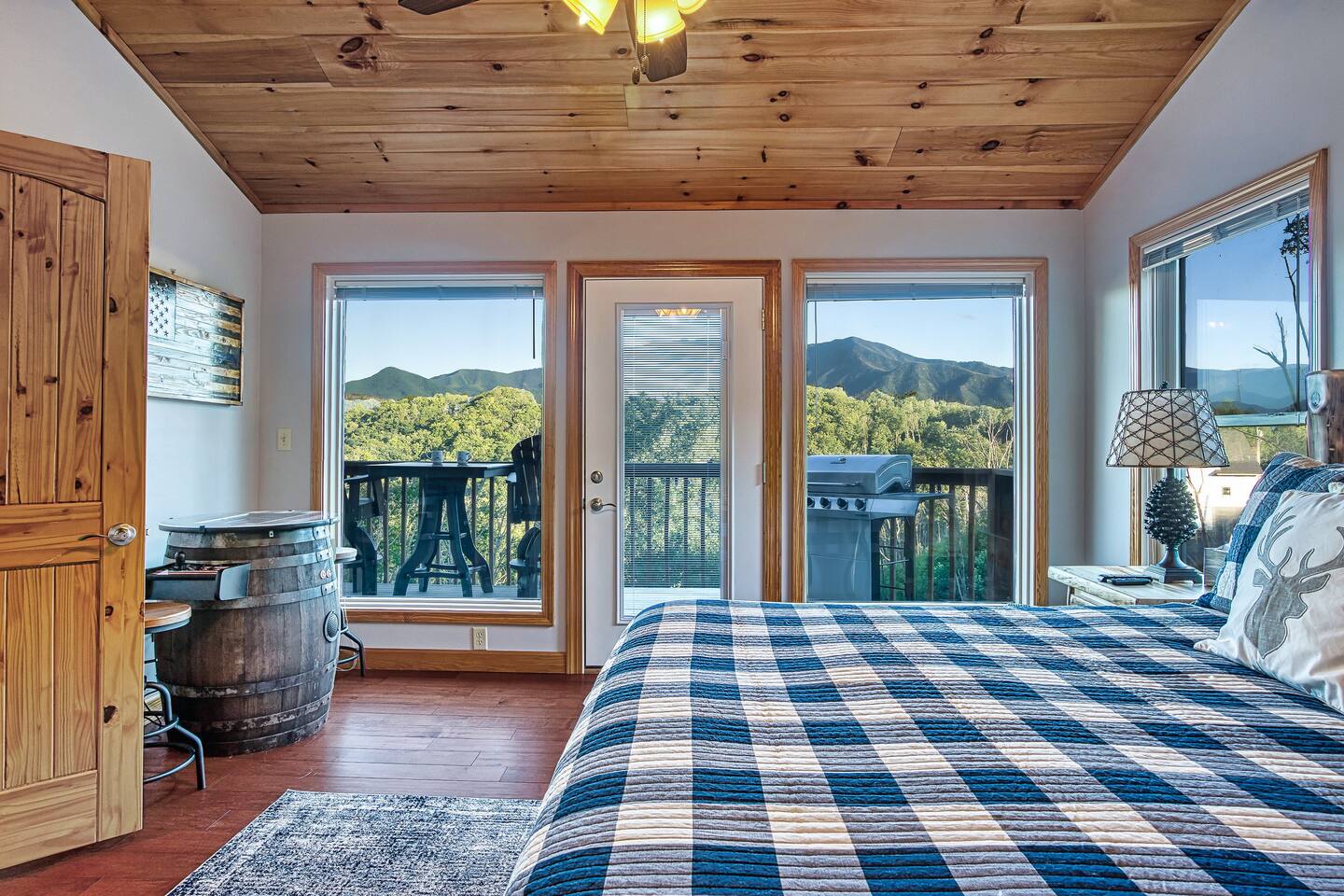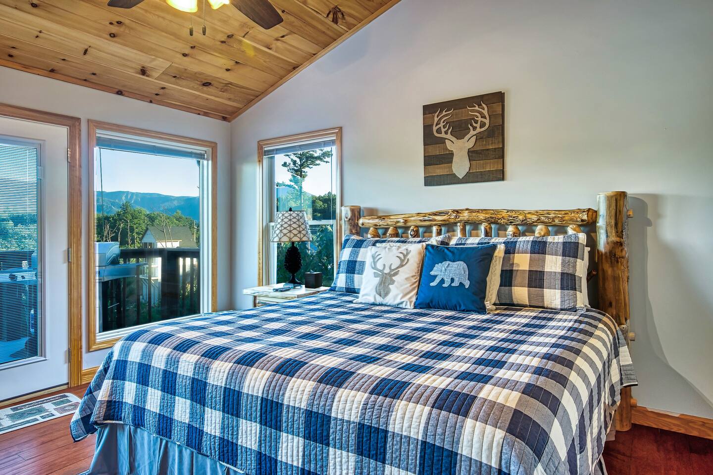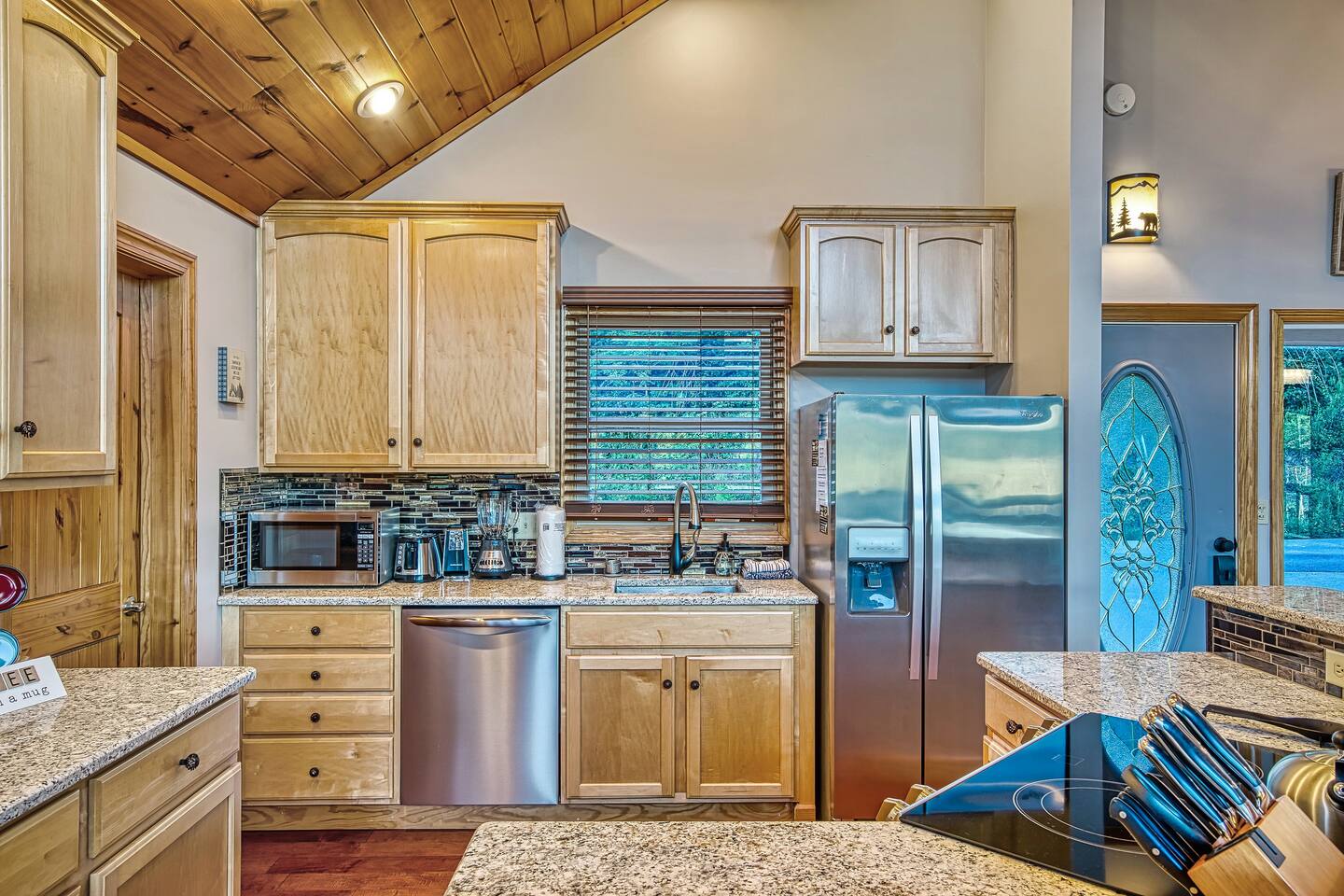 Sleeps 5 ◆ 2 Bedrooms ◆ 1.5 Baths ◆ Open Concept Living Area ◆ Hot tub ◆ Fire pit Perched over Gatlinburg in Chalet Village North, this cabin offers panoramic Smoky Mountain and Mt. LeConte views. Inside, cathedral ceilings, tongue-and-groove walls, and floor-to-ceiling windows frame the mountains perfectly. 🛏️ Bedroom 1 ◆ King bed ◆ Ensuite bath ◆ 55” TV + sound bar ◆ Ceiling fan 🛏️ Bedroom 2 ◆ King bed ◆ Half bath ◆ TV + barrel arcade game ◆ Ceiling fan 🛏️ Comfy sleep sofa in the living room 🛋️ Living Room ◆ Stone fireplace ◆ 55” TV ◆ Wall of windows ◆ Sleep sofa and love seat 🚿 Bathrooms ◆ Ensuite in bedroom 1 ◆ Half bath in bedroom 2 🍲 Kitchen ◆ Fully Equipped (incl. baking sheet, blender, kids' table settings) ◆ Stainless Steel appliances ◆ Wine glasses ◆ Keurig coffee + Tea station ◆ Microwave & toaster 🌄 Large deck with rocking chairs ◆ Panoramic Mountain Views ◆ Fire pit ◆ Hot tub ◆ High-top table ◆ Propane grill (out front)